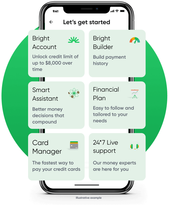 ¹ Bright Credit is a line of credit that can be used to pay off your credit cards. Subject to credit approval. Variable APR range from 9% –29.99%, Credit Limit ranges from $500 - $8,000. APR will vary based on prime rates. Final terms may vary depending on credit review. Monthly Minimum Payments are as low as 3% of the outstanding principle balance plus the accrued interest. Also, you can choose to pay more than the minimum due if you want to pay down the loan faster. Banking services provided by Evolve Bank & Trust; Member FDIC and CBW Bank, Member FDIC. Credit line originated by Bright or CBW Bank, Member FDIC. Products and services subject to state residency and regulatory requirements. Bright Credit is currently not available in all states.